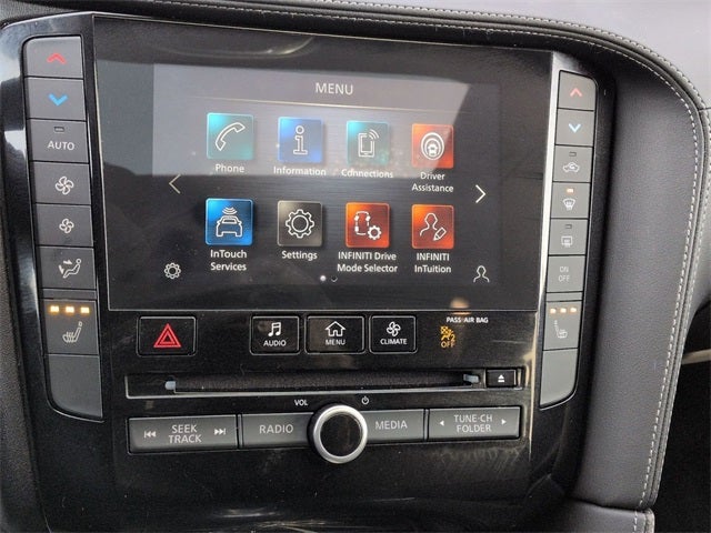 - Radio: AM/FM/CD Audio System -inc: 6 speakers, 4 USBs, INFINITI InTouch dual display system w/upper 8" and lower 7" HD touch screens, wireless Apple CarPlay and Android Auto, HD Radio technology, SiriusXM radio w/advanced audio features and 90-day complimentary trial, INFINITI voice recognition, INFINITI InTouch services, Siri eyes free, WiFi hotspot, Bluetooth® hands-free phone and audio streaming and active noise cancellation