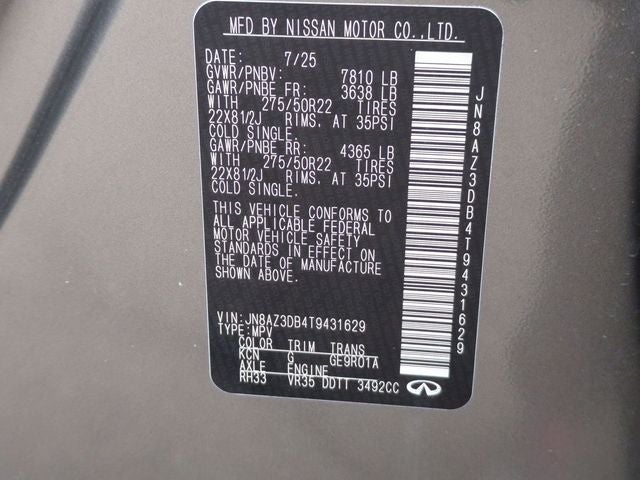 Thank you for considering Lafontaine INFINITI Nissan for your next vehicle! We are home of the Family Deal, and the buy 3, 1 free tire guarantee! All vehicles go through a rigorous inspection process, are serviced to the highest standards, and detailed with state of the art equipment before being placed on the lot. Stop by for your own family deal today! Check out the Features on this one Navigation system: Google Built-in, Power Liftgate, 3rd row seats: bench, 4-Wheel Disc Brakes, ABS brakes, Adaptive suspension, Air Conditioning, Alloy wheels, AM/FM radio: SiriusXM with 360L, Anti-whiplash front head restraints, Apple CarPlay/Android Auto, Audio memory, Auto High-beam Headlights, Auto tilt-away steering wheel, Auto-dimming door mirrors, Auto-dimming Rear-View mirror, Auto-leveling suspension, Automatic temperature control, Brake assist, Compass, Delay-off headlights, Driver door bin, Driver vanity mirror, Dual front impact airbags, Dual front side impact airbags, Electronic Stability Control, Emergency communication system: INFINITI InTouch, Four wheel independent suspension, Front anti-roll bar, Front Bucket Seats, Front Center Armrest, Front dual zone A/C, Front reading lights, Fully automatic headlights, Garage door transmitter: HomeLink, Genuine wood dashboard insert, Genuine wood door panel insert, Heads-Up Display, Heated and Climate Controlled Front Bucket Seats with Massage, Heated door mirrors, Heated front seats, Heated rear seats, Heated steering wheel, HVAC memory, Illuminated entry, Knee airbag, Leather steering wheel, Low tire pressure warning, Memory seat, Occupant sensing airbag, Outside temperature display, Overhead airbag, Overhead console, Panic alarm, Passenger door bin, Passenger vanity mirror, Power door mirrors, Power driver seat, Power moonroof, Power passenger seat, Power steering, Power windows, Radio data system, Radio: Klipsch Premiere Audio System, Rain sensing wipers, Rear air conditioning, Rear anti-roll bar, Rear reading lights, Rear seat center armrest, Rear window defroster, Rear window wiper, Reclining 3rd row seat, Remote keyless entry, Security system, Speed control, Speed-sensing steering, Split folding rear seat, Spoiler, Steering wheel memory, Steering wheel mounted audio controls, Tachometer, Telescoping steering wheel, Tilt steering wheel, Traction control, Trip computer, Turn signal indicator mirrors, Unique SPORT Semi-Aniline Leather Seating Surfaces, Variably intermittent wipers, Ventilated front seats, Ventilated rear seats, and Wheels: 22 x 8.5J Unique SPORT Alloy.